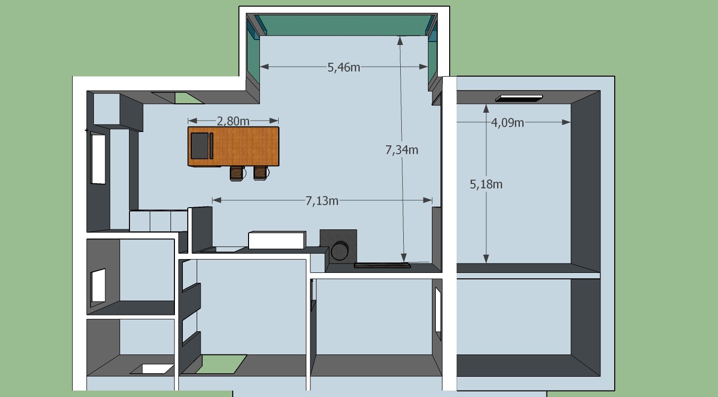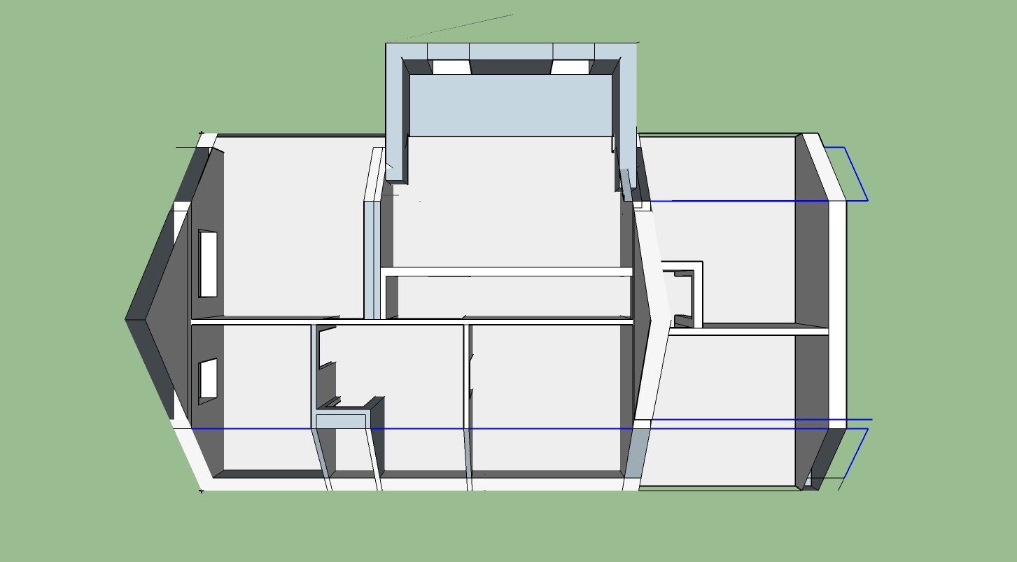 Zusätzlich möchten wir einen Kapitänsgiebel einziehen. Der soll im EG Mehr Helligkeit und Platz schaffen (und meiner Frau den Wunsch nach einem Wintergarten ansatzweise nachkommen). Im OG erlaubt uns der zusätzliche Giebel, etwas vom mittleren Zimmer abzuziehen und in einen Flur zu wandeln. Damit könnten wir 6 Schlafzimmer im OG realisieren. Ich hab mal eine Skizze angehängt (an der ihr auch seht, dass Sketch Up und ich noch nicht die besten Freunde sind )