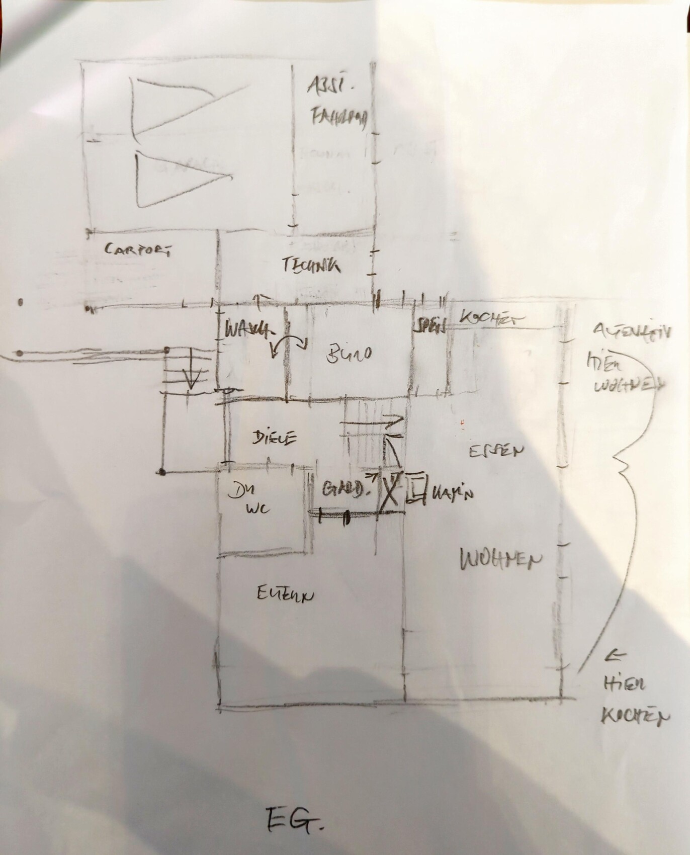 Ich lade gerne die original Skizzen des Vorentwurfs hoch,Das ist ziemlich genau der Stil auch meiner Kritzeleien (außer daß ich die meist mit Kuli mache).Architekten zeichnen eben ohne darauf zu schielen, daß es wie im Bauzeichnerstyle aussieht.