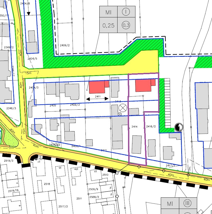 Für das obere Bau-Fenster (Blau eingezeichnet) gibts den Bebauungsplan mit Angaben. Im unteren Baufenster (Blau eingezeichnet) gibt es keine Vorgaben.