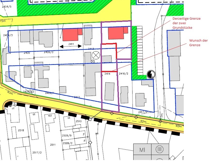 Bei "Bebauungsplan2" hab ich mal eingezeichnet wo die Grenze zwischen den beiden Grundstücken verläuft und wie ich sie gerne verschieben würde (ungefähr).