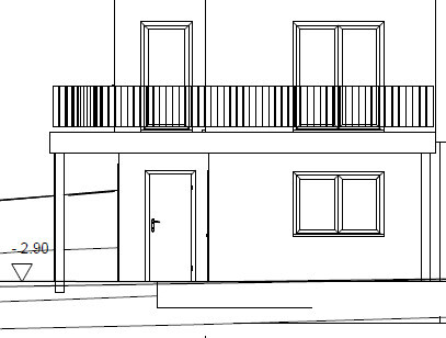 Außenansicht eines Gebäudes mit Balkon, Tür und Fenstern als Architekturzeichnung.