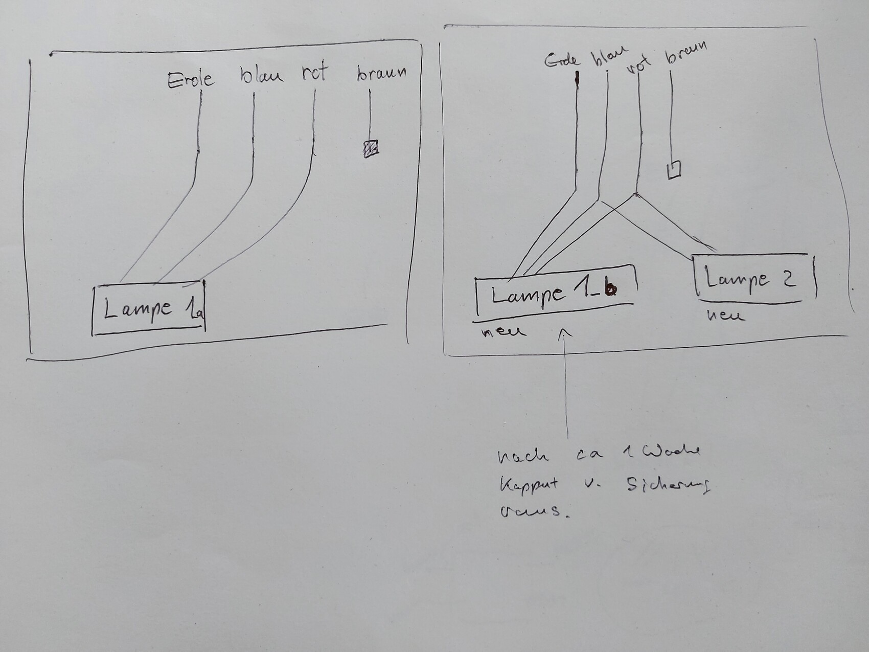 Kurzschlüsse brauchen keine Woche, um kurzzuschließen. Klingt eher, als stimmt was mit der/einer neuen Lampe nicht. Braun ist quasi abgeklemmt - oder wie ist das Bild zu deuten? Rot ist die Phase? Das ist eigentlich keine verbreitete Farbgebung bei mehradrigen Kabeln. Die Lampe am Spiegel schaltet sich mit der anderen Lampe zusammen ein?