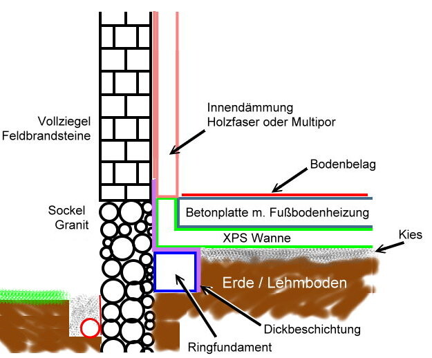 Erreicht werden soll ein gedämmter Betonboden incl. Fußbodenheizung zur direkten Verlegung eines geeigneten Bodenbelags ohne zusätzlichen Estrich. Weiter wird natürlich ein Übergang der Bodendämmung auf die Wanddämmung ohne Kältebrücken angestrebt. Verputzt wird später (innen) mit Lehm oder Kalkputz.