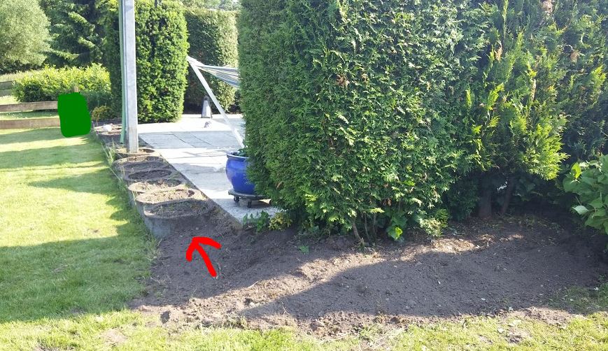 ich habe am Ende der Terrasse ein Beet aus alten Pflanzenkübel (roter Pfeil), die nicht nur unschön aussehen, sondern auch unpraktisch sind. Ein paar habe ich schon entfernt (Vordergrund), die Frage ist, wie gestalte ich es dort neu? Hat jemand Ideen? Das Beet soll ruhig doppelt so breit werden wie jetzt. Die Höhe muss/soll erhalten bleiben, damit die Terrasse an Ort und stelle bleibt.
