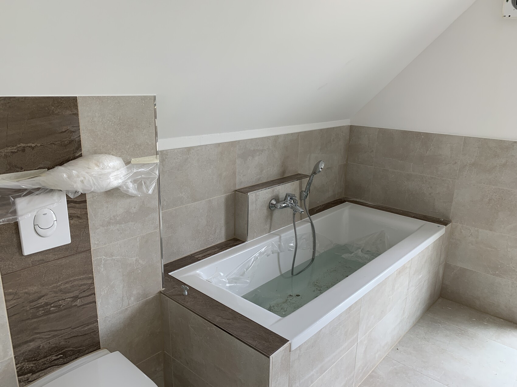 [ATTACH type="full" alt="Badezimmer mit rechteckiger Badewanne, Handbrause, beige Fliesen, teilweise mit Schutzfolie." width="500px">K
