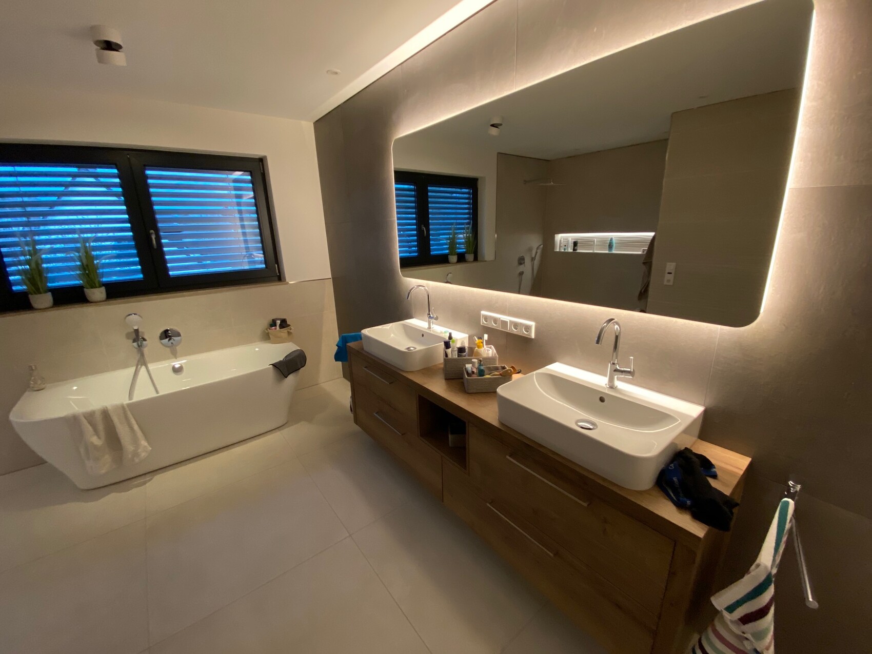 Vielleicht würde sich ja anbieten dies jeweils auf Badewannenhöhe anzugleichen, bzw. hinten am Fenster die Erhöhung auf ein Minimum für die Armatur zu reduzieren. So wie ich es gelöst habe:man braucht da keine Vorwand. Ich finde es kann auch sehr harmonisch aussehen obwohl die Fensterbank direkt über der Wanne ist. Kommt halt auf das Gesamtbild an.