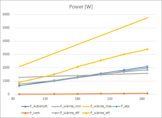 P_wärme_eff (was an Heizwärme bleibt nach Erwärmung der Zuluft) ist hier grau mit einer geringeren Verdichterfreq. (ca. 60Hz bei Max. Luftstrom) und in den gelben Kurven für die Max. Freq. dargestellt. P_vent ist Ventilation (und Pumpe). P_abs ist der benötigte Strom. Enteisungszeiten sind approximiert mit eingeflossen (effektivitätsmindernd während kalte Luft weiterströmt).