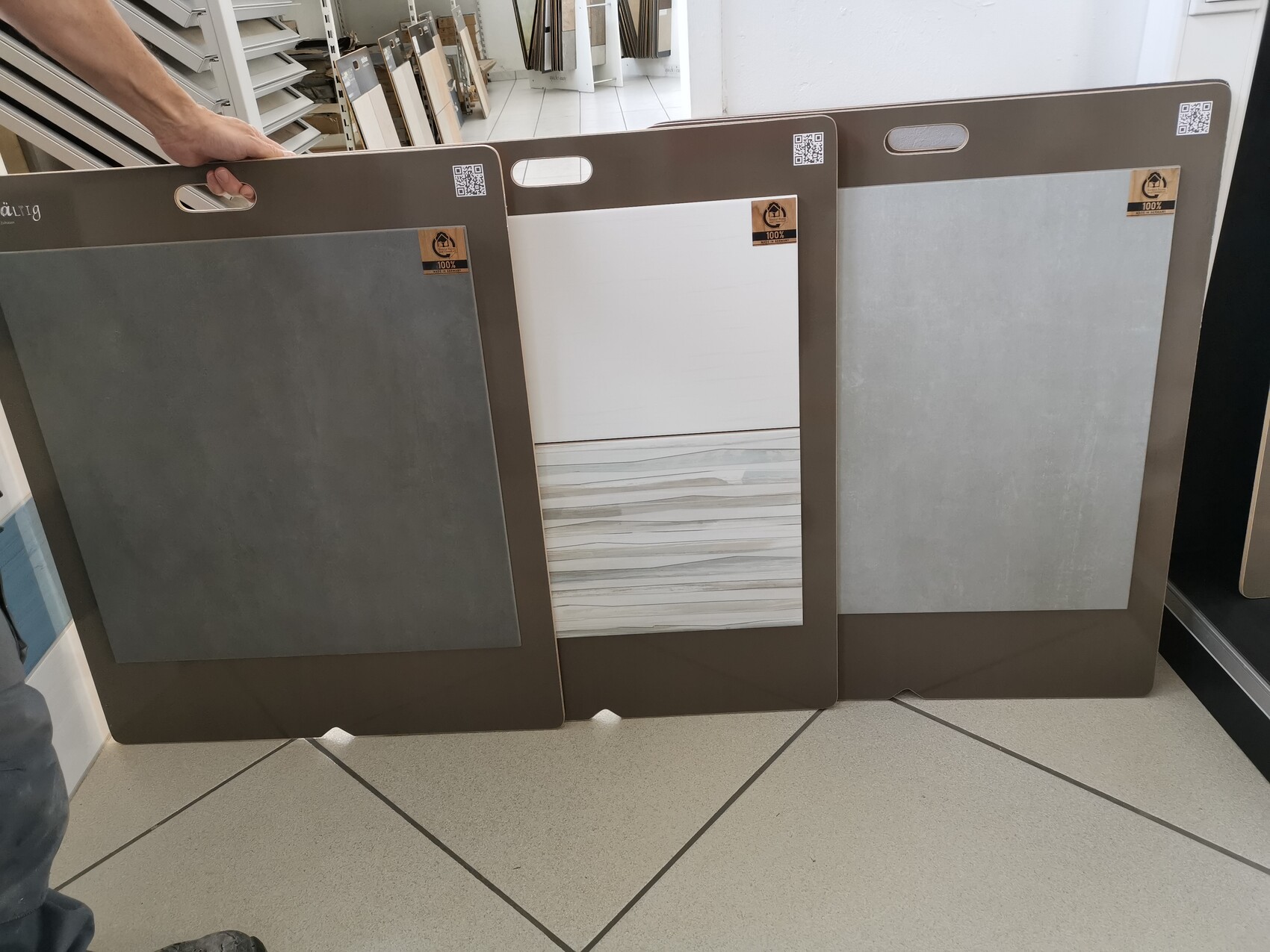 Drei braune Fliesen-Mustertafeln im Laden; Hand hält linke Tafel, mittlere weiß, rechte graue Platte.