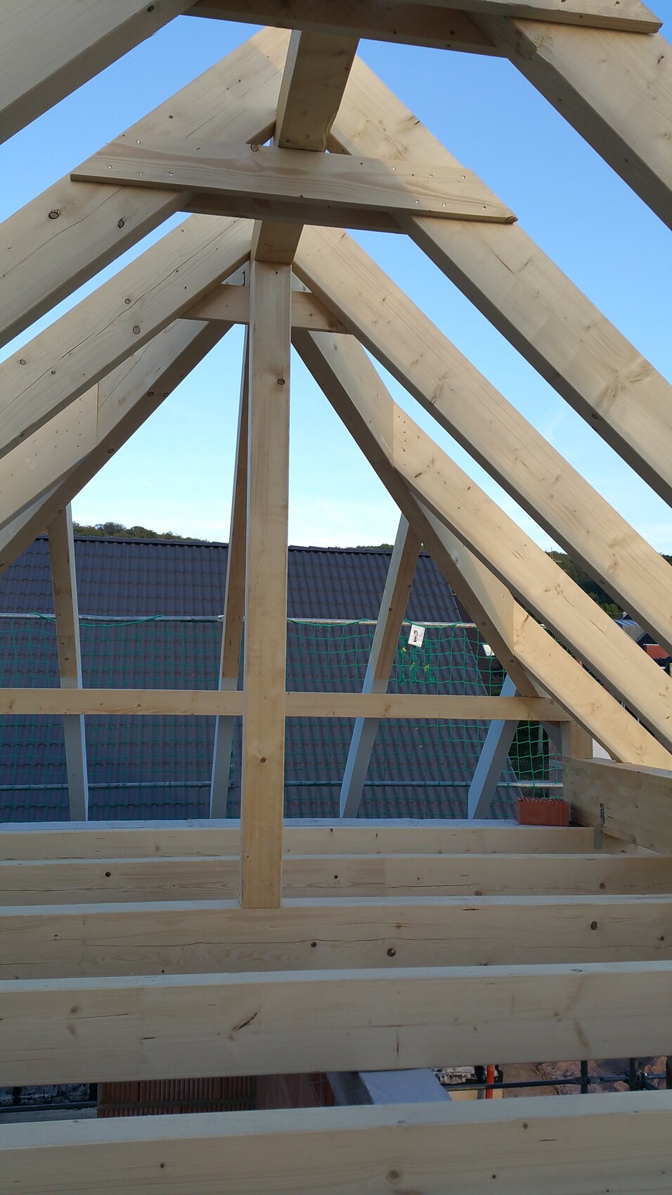 Was man sieht: Der Ringanker auf den Außenwänden liegt höher als auf den Innenwänden. Hinten liegt die Mittelpfette auf dem äußeren Ringanker auf. Mittig liegen die Deckenbalken auf dem inneren Anker. Der äußere ist so viel höher, wie die Deckenbalken hoch sind.