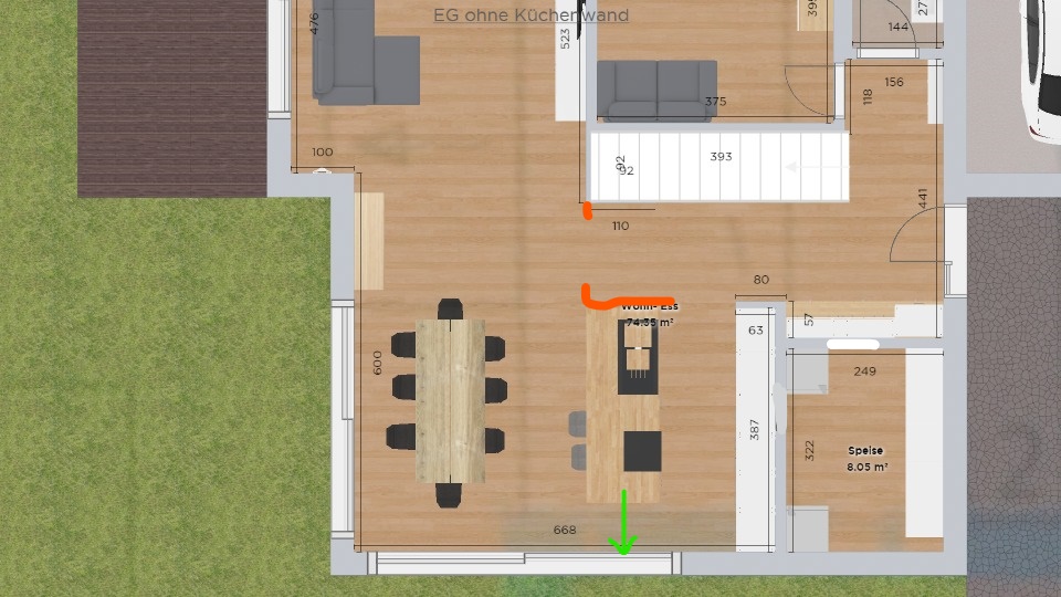 Rot sind nur Wandscheiben. Zum Flur lässt Du nur Durchgänge. Sollte das stören, ist eine Tür auch später noch schnell eingebaut. Die Insel würde dann zur Halbinsel, und ich würde sie an die Außenwand schieben (grüner Pfeil). Den Zugang zur Speisekammer würde ich von Flur aus machen (also quasi durch die Garderobe). Du kannst die Wand zwischen Flur und Speis nach planunten verschieben um mehr Platz für Garderobe zu schaffen. Ausserdem kann man auch die Fläche unter der Treppe nutzen.