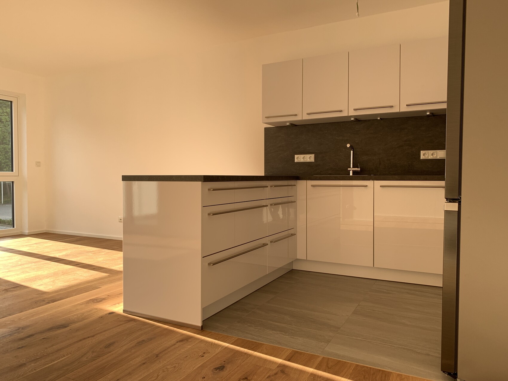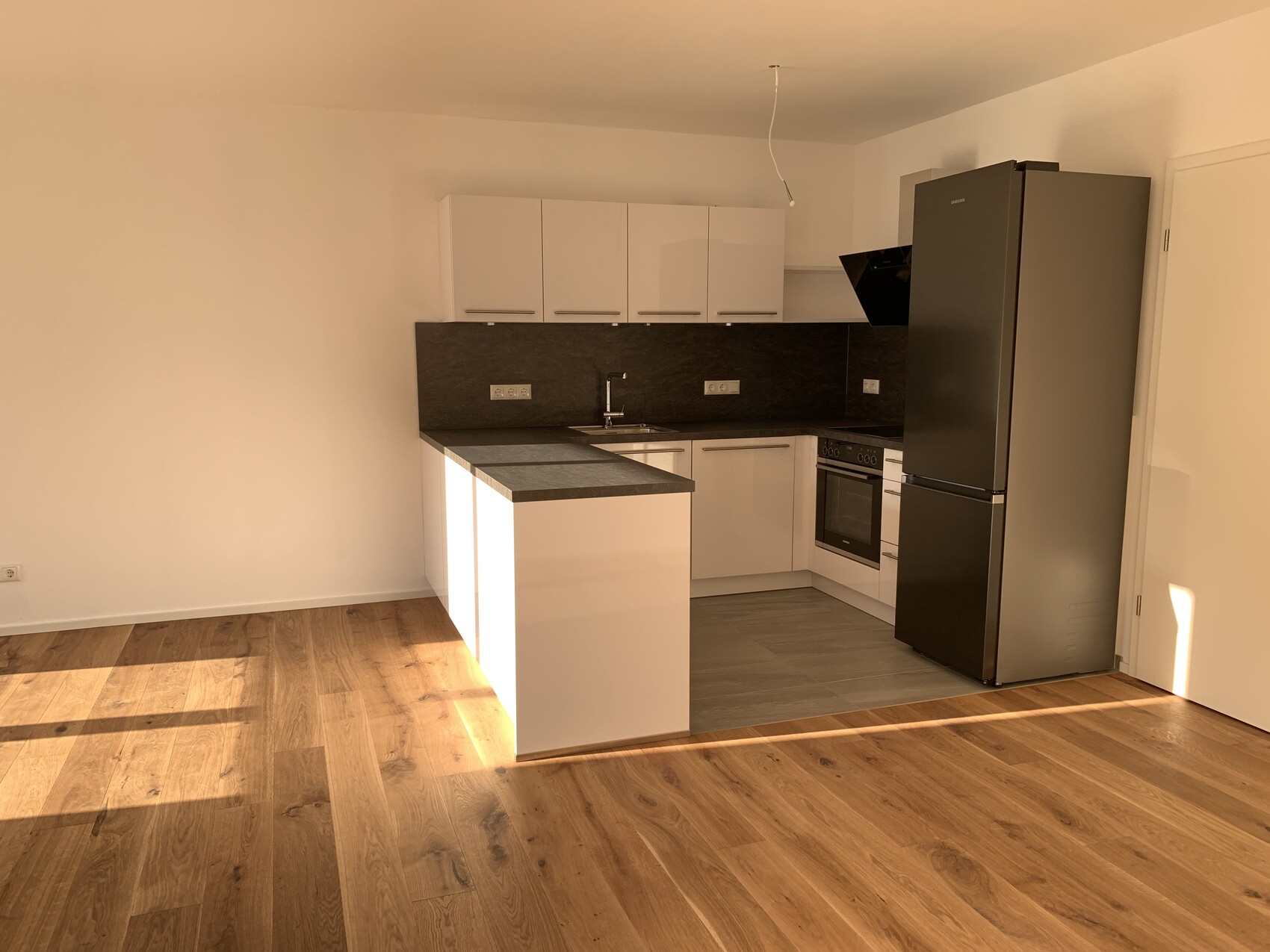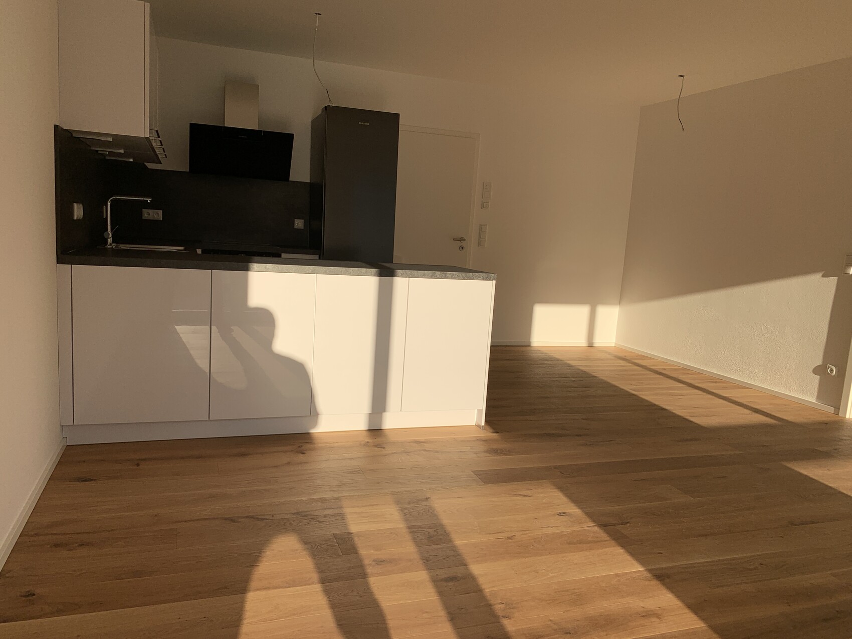 Die Küche wurde nun eingebaut. Der neuen Mieterin gefällt sie und ich finde die Abtrennung zwischen Küchenbereich (Fliesen) und dem Rest (Landhausdielen naturgeölt) gelungen.