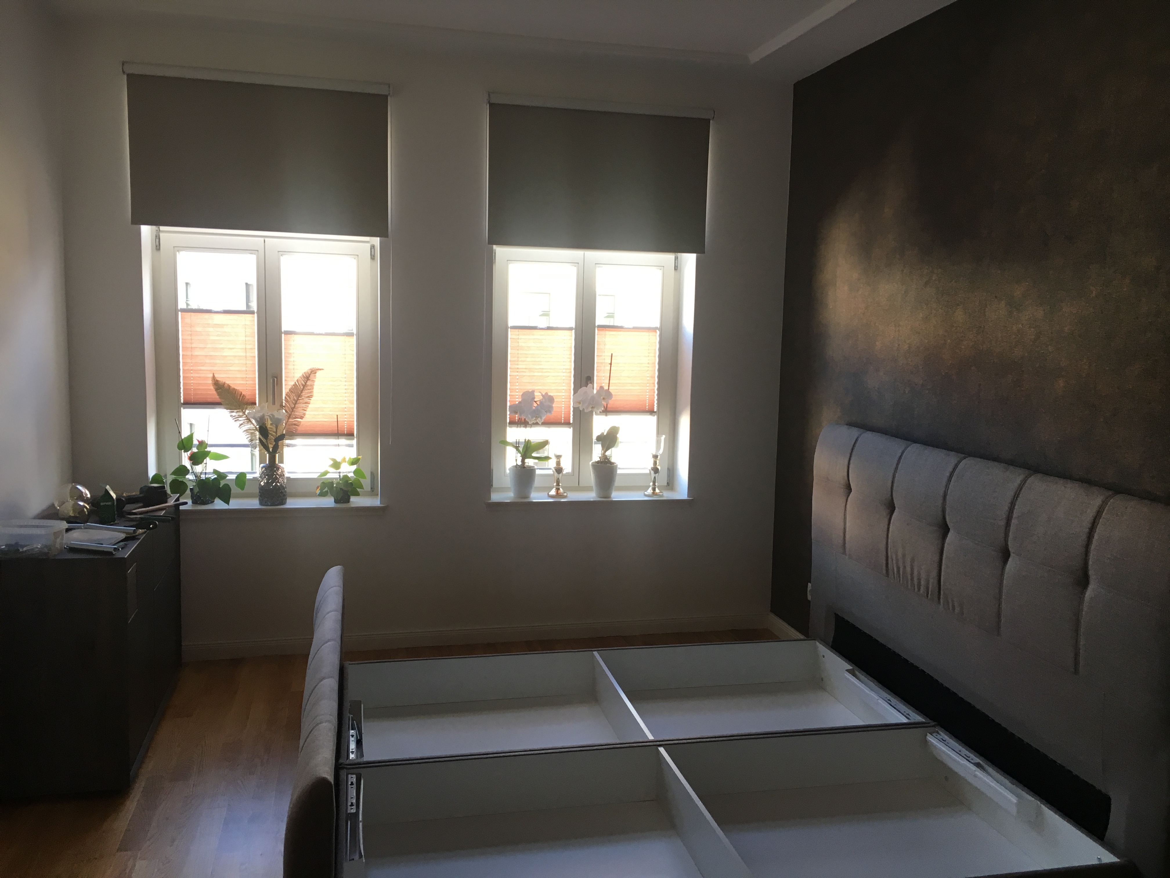 Die Zwischenwand ist entstanden, da das TV Board sons sehr weit weg wäre vom Bett. Aktuell ist zwischen Bett und diesem Board 60cm.