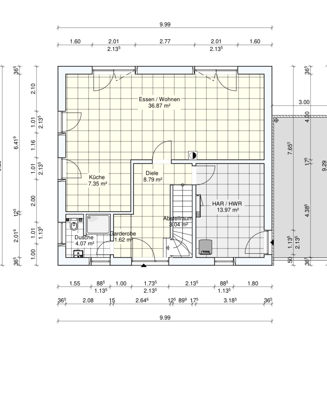 Grundriss eines Wohnhauses mit Ess-/Wohnbereich, Küche, Diele, Abstellraum und HAR/HWR.