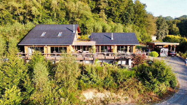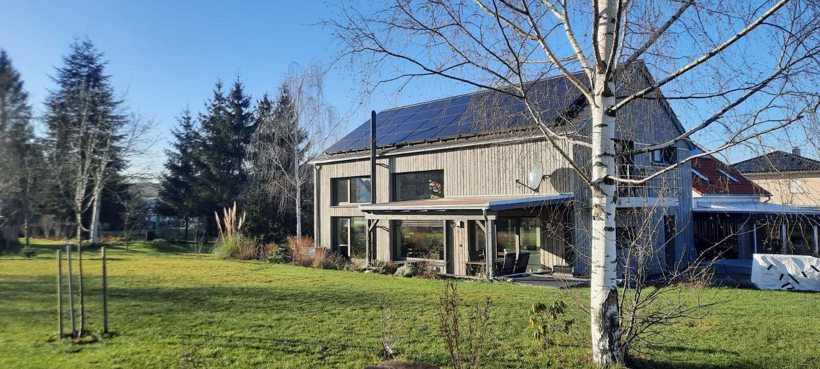 Ich selbst mag Holz. Wir haben eine sehr rustikale Lärchenholzfassade mit einem modernen Baukörper und großen Dachüberständen mit glatten Photovoltaik-Dachziegeln kombiniert. Das Haus ergraut über die Jahre und leuchtet inzwischen nicht mehr so wie zu Beginn. Klingt nach völligem Humbug. Uns gefällt's. Hier eine Drohnenaufnahme aus dem letzten August.