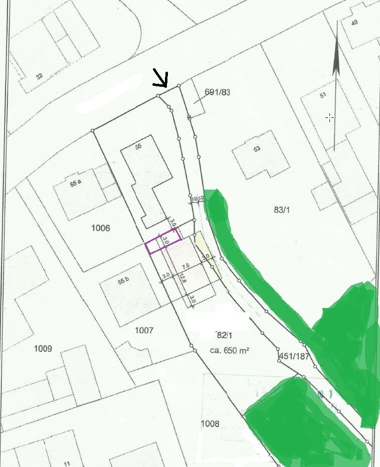 Der Plan ist, auf die Grundstücksgrenze(im Plan oben) ein 3m langes und evtl. 7m langes Carport zu bauen. Das hatte ich im Startpost schon versucht einzuskizzieren: