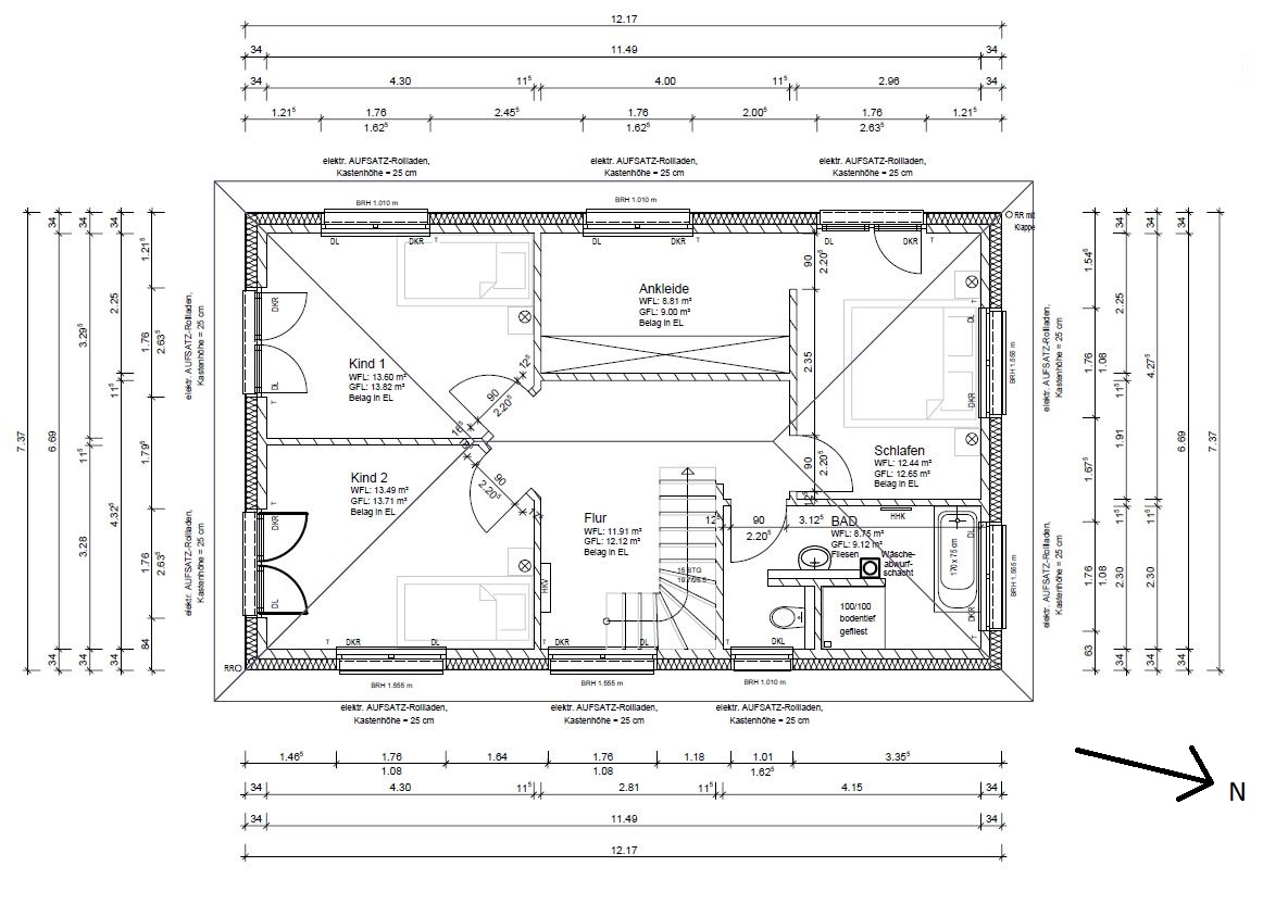 - uns ist insgesamt der Flur zu groß. Die Frage ist, muss der Flur aufgrund des Auslauf der Treppe so breit sein? Oder kann man das Ankleidezimmer breiter/tiefer machen? Wie viel Treppen-"Auslauf" ist nötig/bequem? Ursprünglich hatten wir in unserer Skizze eine 1/2 gewendelte Treppe(s. Startpost). Wir wollten aber lieber eine 1/4 gewendelte Treppe, so wie jetzt in den Entwürfen enthalten, da uns das mehr zusagt. Hatten aber Bedenken, ob das bei dem schmalen Grundriss so passt. Wie kann man hier den Flur im OG besser nutzen? Ein Kinderzimmer(Süd/Ost) größer? Wir bekommen nur die Türen dann nicht sinnvoll angeordnet.