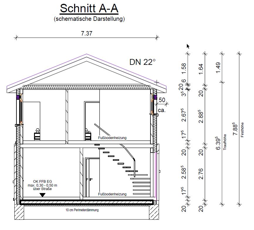 Das Haus soll 2-geschossig werden mit Walmdach. Dementsprechend hätten wir doch nur die Höhe der beiden Geschosse zu berücksichtigen, oder? Also ca. 6m * 0,4 = 2,4m