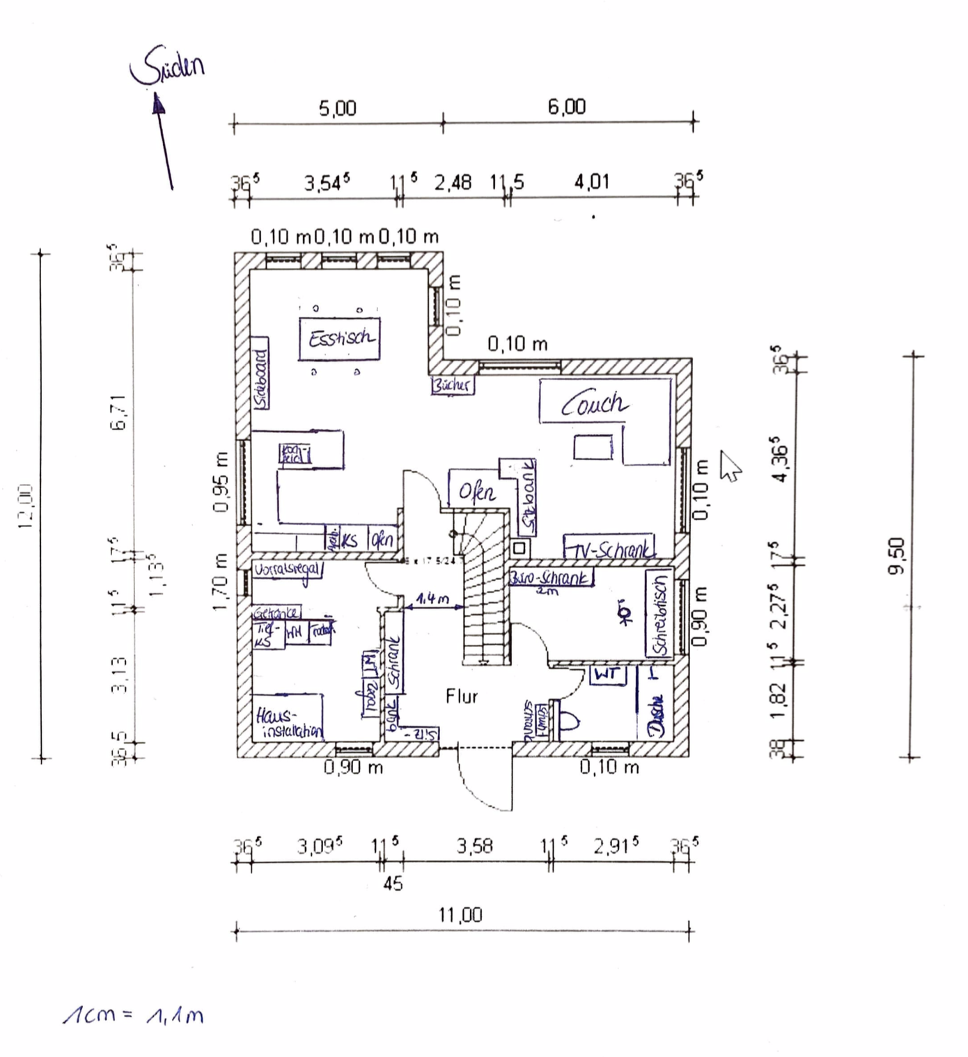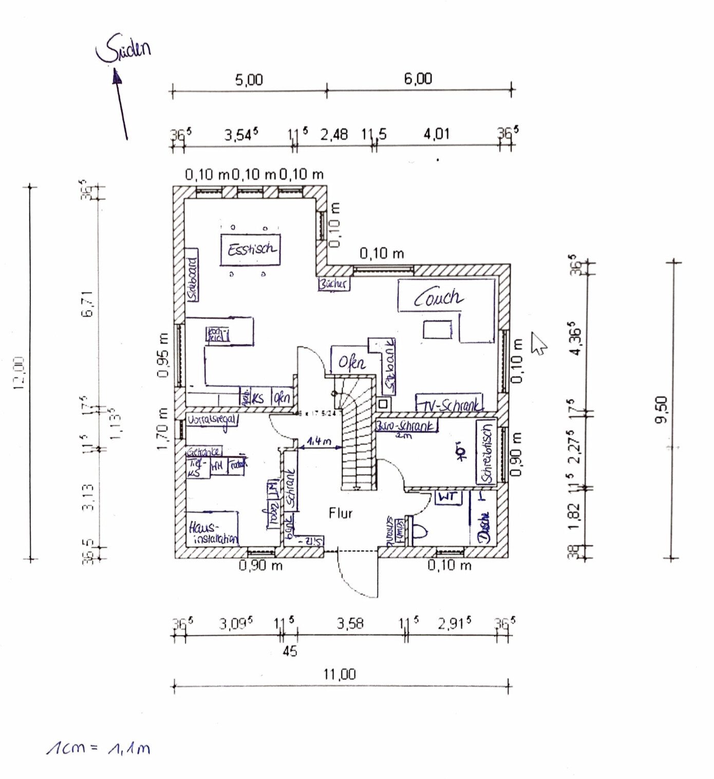 - Bei der Treppe soll es sich um eine geschlossene Treppe handeln -> Daher denken wir, dass der Flur nicht unbedingt zu groß ist, weil eine geschlossene Treppe den Raum kleiner werden lässt. Hier sind wir uns aber auch nicht ganz sicher
