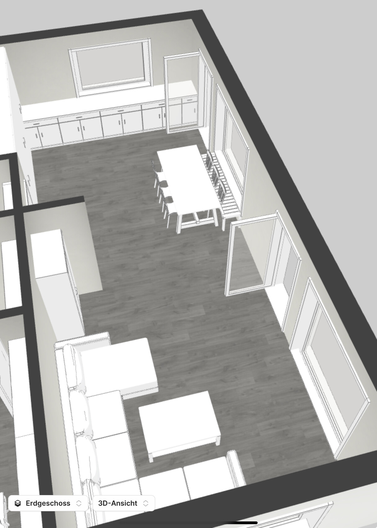 Falls Du das nochmal zeigen willst?Habe ich gemacht. Aber die Wand stört da wirklich. Habe sie mal testweise entfernt und statt Schrank dann etwas kleineres eingefügt. Mir wird es etwas zu wenig Fensterfläche Richtung Garten, aber ansonsten wirkt es so schon größer. Ich vermisse allerdings schon die Struktur die es mit der kleinen Wand und dem Esstisch in der Küche gab.
