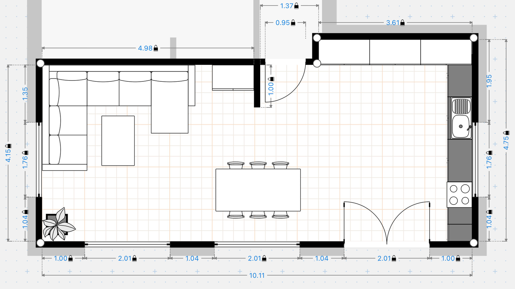 Stell doch mal den Tisch quer rein IN den Raum mit korrekten Maßen und zwar ggü. dem Eingang.Würde dann so aussehen. Der Meter Wand hat uns nachträglich auch geärgert. Statik etc. wurde so berechnet und da diese Wand tragend ist würde eine Änderung zu Mehrkosten führen (Höhe kennen wir nicht).