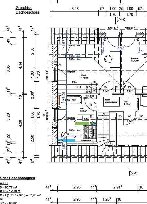 Auf dem Bild seht ihr unseren zweiten Versuch, wie er vom Planer an uns übergeben wurde. Nun sagt allerdings unser GU, dass wir mit der Dusche (an der 2 m Linie, die 2,3m Linie ist falsch) zu weit unter der Schräge sind und es zu eng wäre. Deswegen würde uns interessieren, ob ihr das auch so seht bzw. wie weit wir rutschen müssten (wahrscheinlich wird es zu eng mit dem Waschbecken und der Tür, sodass wir zur Not ein bisschen in das Kinderzimmer rücken würden). Da wir das eigentlich vermeiden möchten, wären wir auch für alternative Ideen offen.