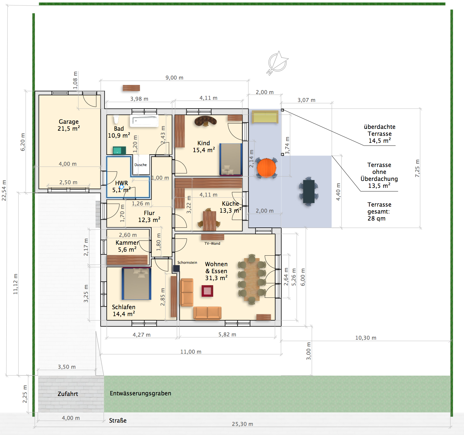 Anbei eine Idee zum Grundriss mit Maßen, Grundstück und Nordpfeil. Den entstehenden Platz wandeln wir in eine Kammer um.