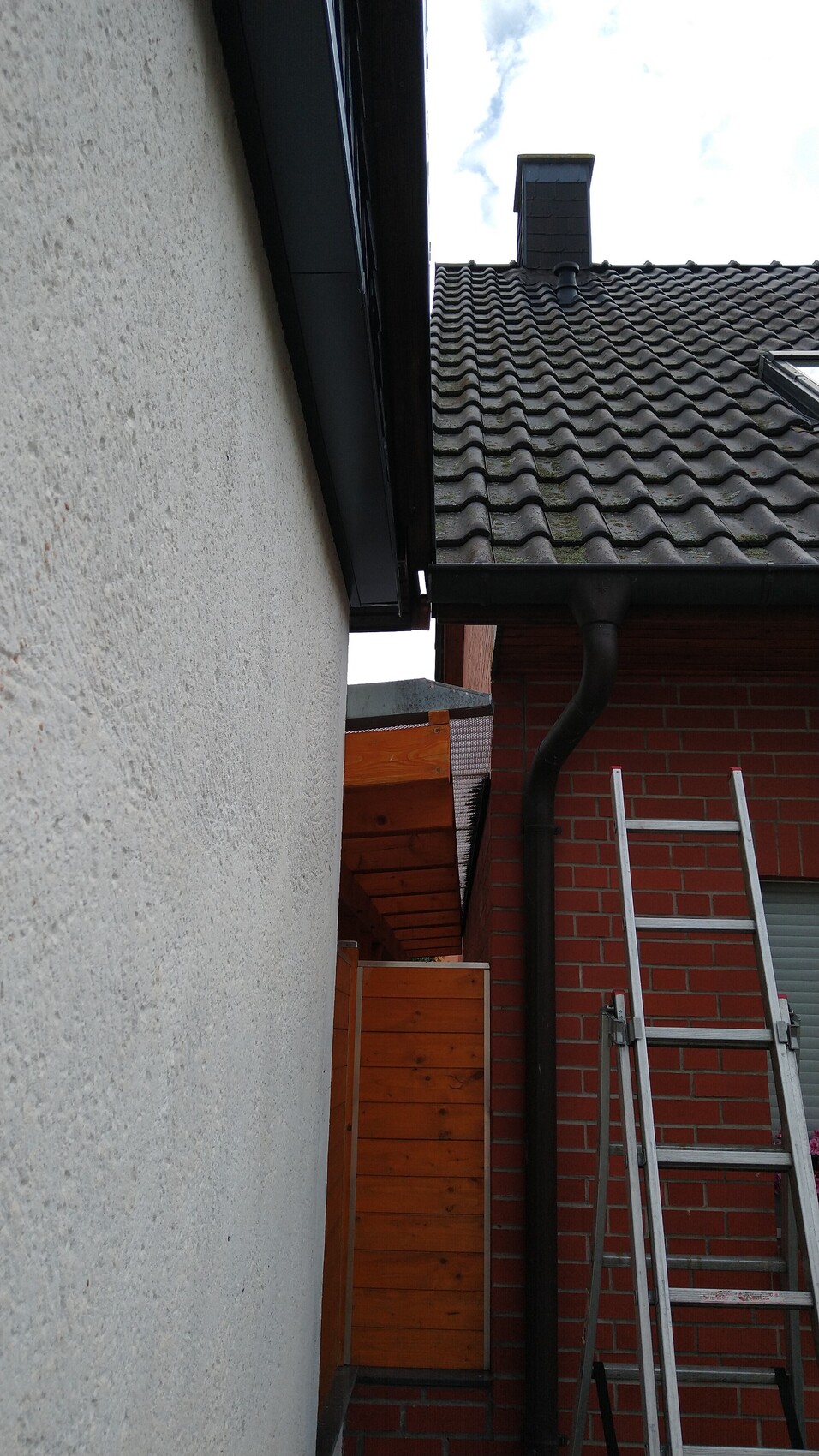 Heute habe ich zufällig bemerkt, dass der Ortgang, der bislang vor unserem Dach abgeschlossen hat, nun auf unserem Dach aufliegt. Zum besseren Verständnis zwei Bilder...