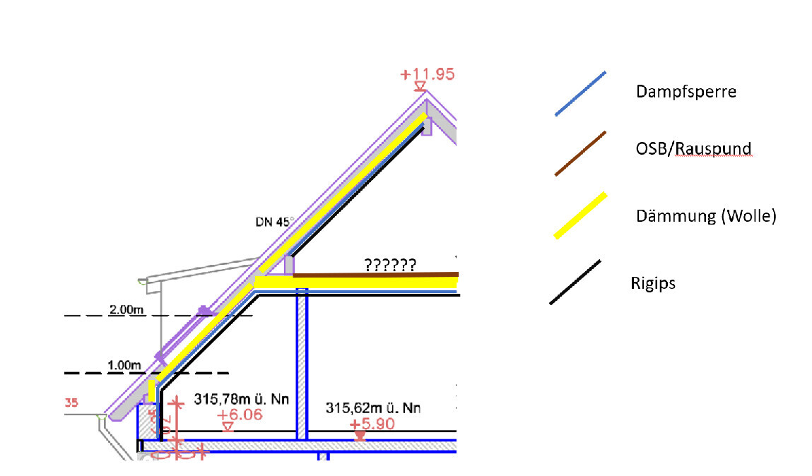 Da die Dampfbremse unten (Im Wohnraum) durchgezogen ist kannst du auch OSB verlegen, Ich würde für den Fall einer Verletzten Dampfbremse (Im Wohnraum) und damit Feuchtigkeitseintritt in die Dämmung jedoch auf Rauspund zurückgreifen.