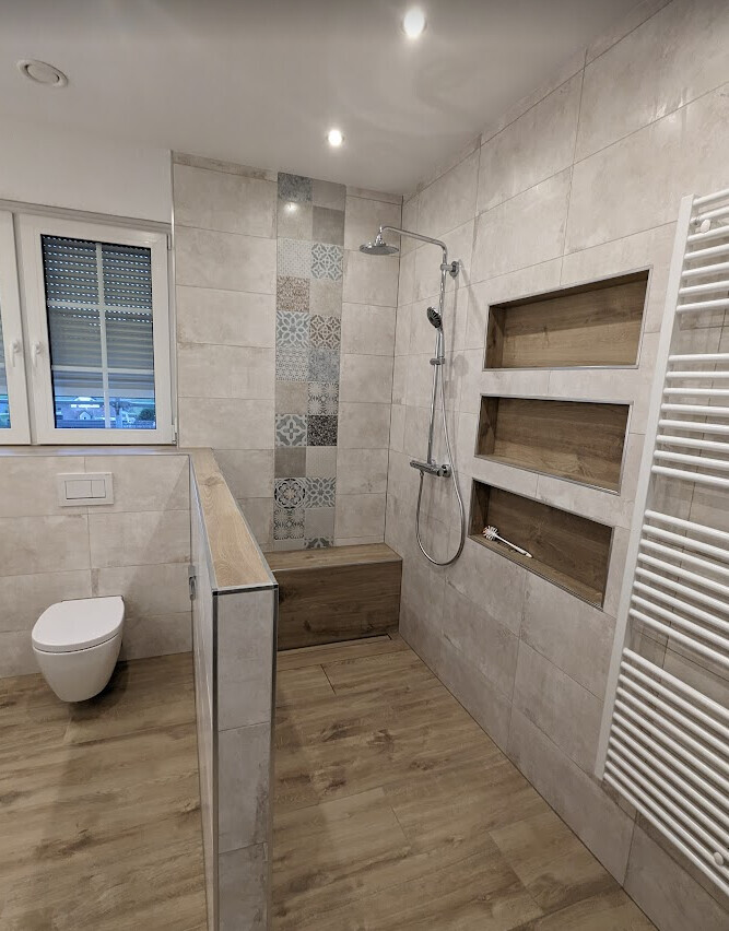 Die Dusche hätte Licht - die eine Seite eine Glaswand, die Mauer beim Klo soll nur halbhoch sein (~120 cm sein)