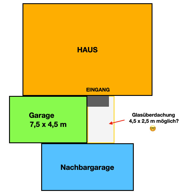Rein zum Verständnis: In dem Fall hätte er aber keinen Nachteil, da meine Überdachung auch direkt an seiner Garage angrenzen würde und somit die bestehenden Abstandsflächen eigentlich nicht beeinflusst werden!?In einer Abstandsfläche darf man nichts bauen. Wenn er deine Abstandsfläche übernimmt und dort bereits die Garage steht, würde die Garage illegal. Und deshalb würde ich als Nachbar auch nichts tun womit im Fall des Falles jemand eine offizielle Akzeptanz deiner Überschreitung der Grenzlänge nachweisen kann.Ich wage die Vermutung, ein seitlicher Bauwich sei hier gar nicht betroffen, mithin auch nichts durch eine Abstandsflächenübernahme oder dergleichen regelbar. Der Abstand zur straßenseitigen Grundstücksgrenze hängt nicht von Nachbarzustimmung ab, von der des Nebennachbarn schon gar nicht.
