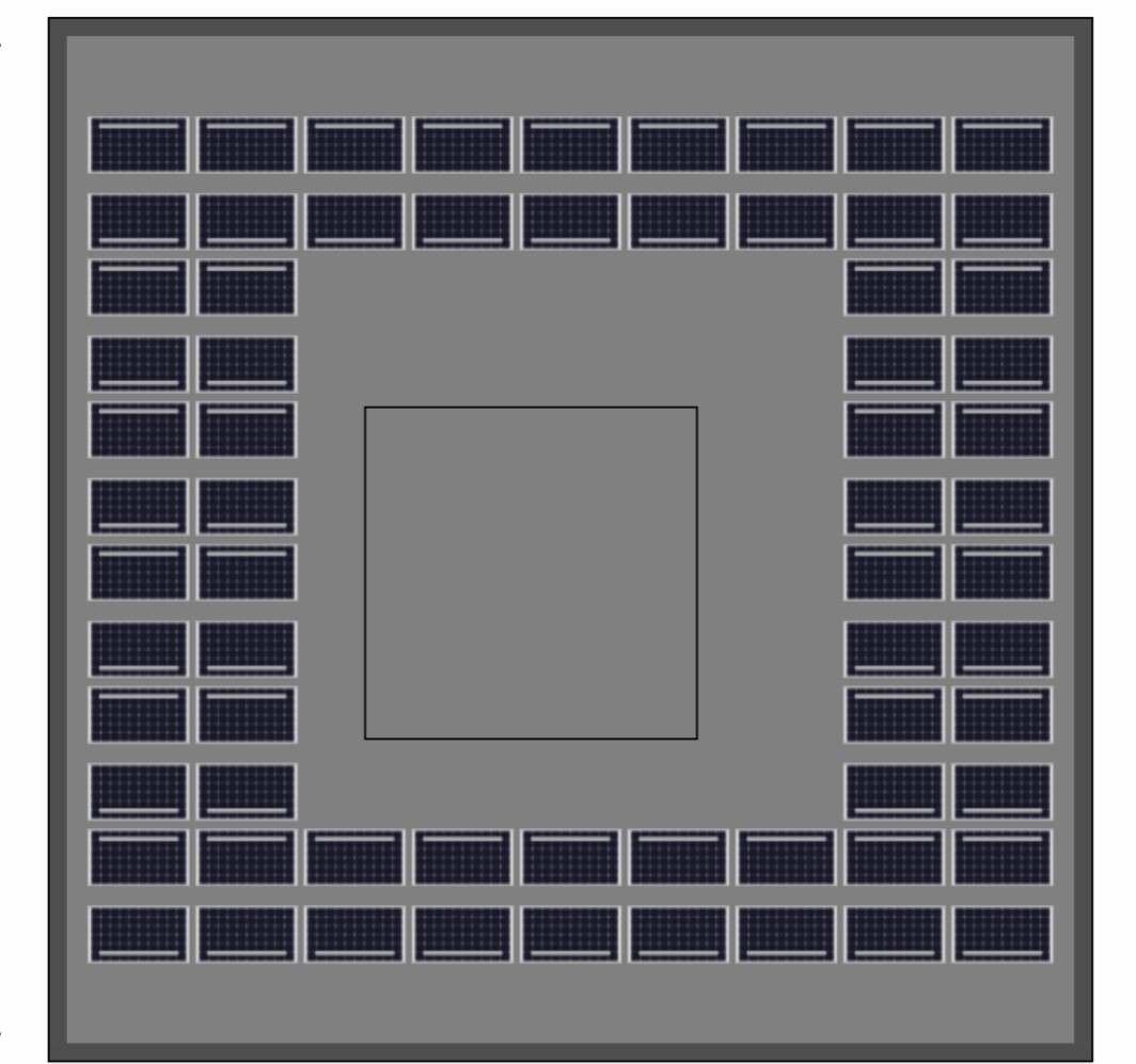 Draufsicht auf quadratisches Gelände mit vielen Solarpanels am Rand, zentral freier Innenraum.
