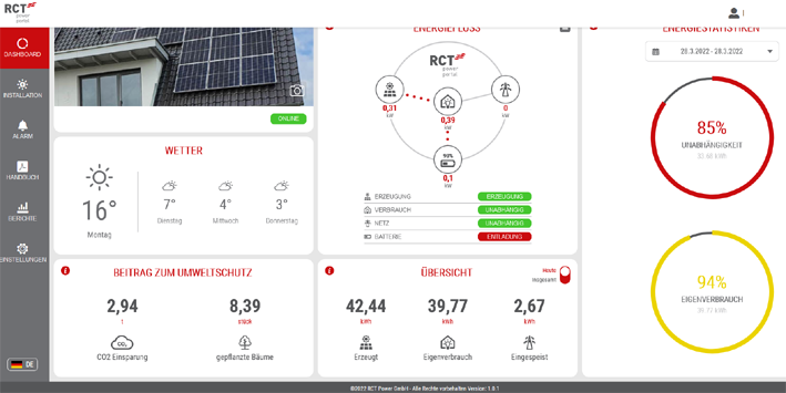 Dashboard-Anzeige zu Energie: Solaranlage am Dach, Wetter, CO2-Einsparung und Verbrauch