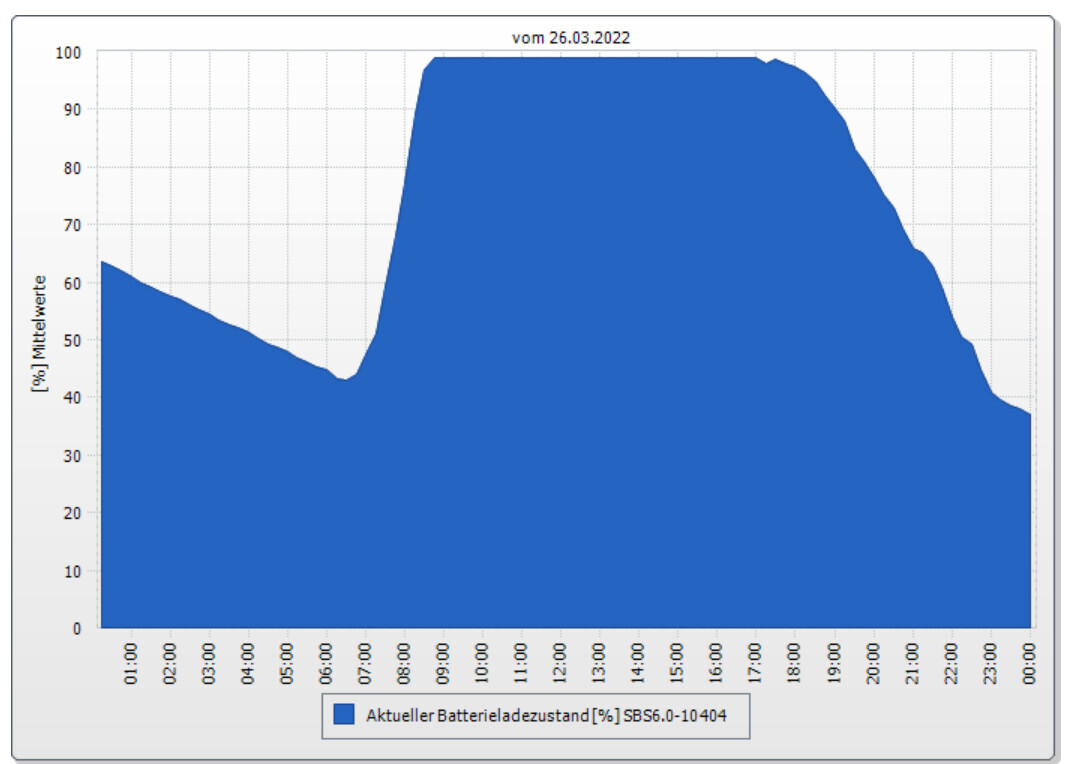 Tagesverlauf des Batterieladezustands am 26.03.2022: Anstieg auf 100%, danach Abfall.