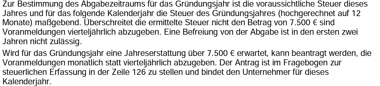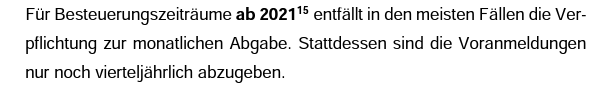 Es sind also nur noch 4x pro Jahr die drei Klicks.Im Gründungsjahr ist die Höhe der USt (dem FA) aber unbekannt, daher ist Standard das im ersten JAhr monatliche USt-Anmeldungen erfolgen. Danach kann man alles abstimmen. Ich empfehle direkt zur ersten USt-Jahreserklärung ein formloses Schreiben beizufügen, um nur noch jährlich abgeben zu müssen.