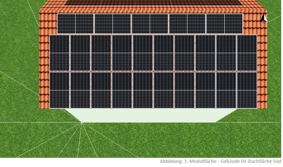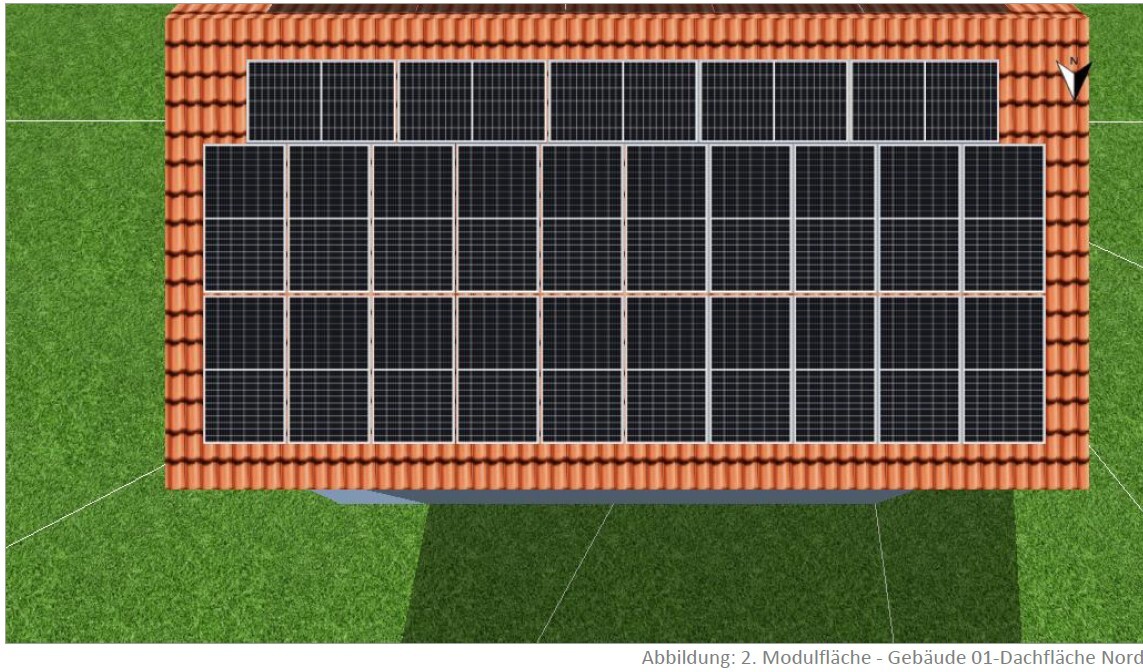 Anbei die Angebotsdetails und die Dachbelegung. Im Süden wird er die Module aufs Dach legen (25° Dachneigung) und im Norden leicht aufständern (21°).