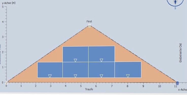 Dachkonstruktion und Ausrichtung absolut identisch mit dem TE. Nach ersten Gesprächen mit dem Solarteur bekommen wir max. 5,84 kwp auf das Dach (bei 18! Modulen - 6 Module auf einer Dachseite).