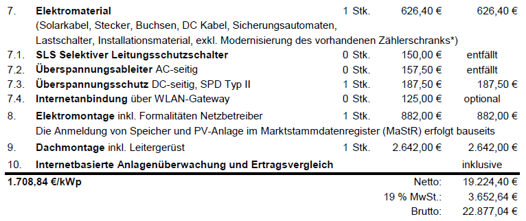 Die Kosten für das Montagegestell (1.426,50 EUR netto) dürfte m. E. noch entfallen,Das Montagegestell sind die Aluminium-Schienen, auf denen die Module verschraubt werden. Ohne die kommst Du nicht weiter.Das Leitergerüst dürfte allerdings wegfallen, da Du ja ein Gerüst hast.