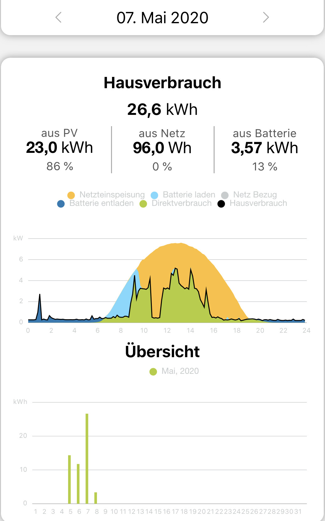 Aber das kann ich erst nach nem ganzen Jahr sagen.Den Zahn kann ich dir jetzt schon ziehen. Du musst ja nur überlegen, das ab der Zeitumstellung ab 17 Uhr nichts mehr runter kommt und die ganze Action im Haushalt erst losgeht, die Wärmepumpe noch nicht mitgerechnet (zumindest bei uns, oder hast Du Gas zum heizen?). Man kann es nur abmildern indem man Trockner, Waschmaschine und Kochen, Backen auf die Mittagszeit legt. Und schon da gehe ich ohne Speicher nicht von 40% Autarkie im Jahresmittel aus.Tego1208.05.20 15:21