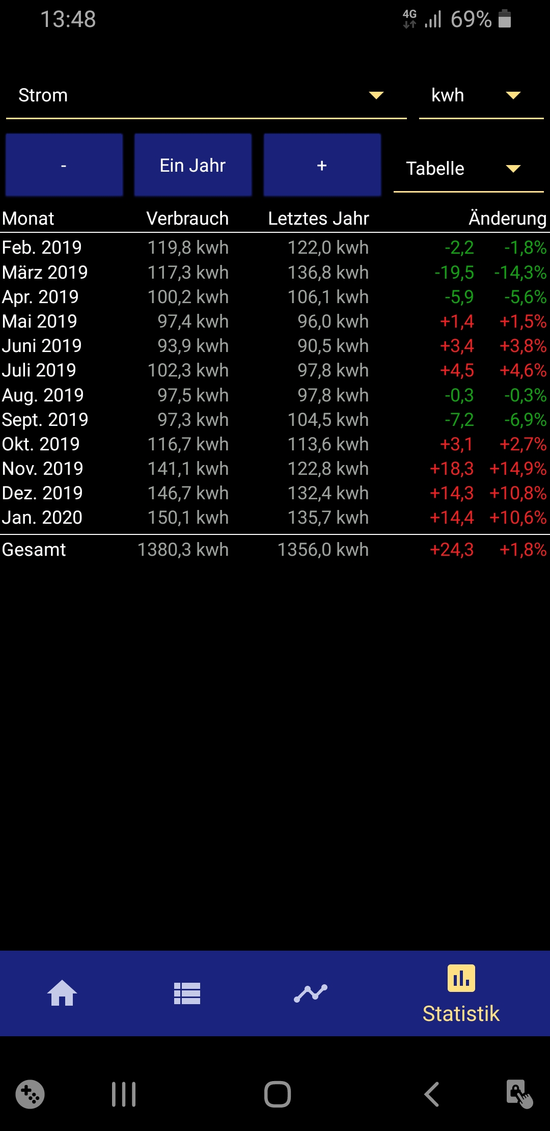 Momentan steigt unser Verbrauch ein bisschen da meine Frau in Elternzeit ist aber hier ist die Auswertung von Februar 2018 bis Januar 2019