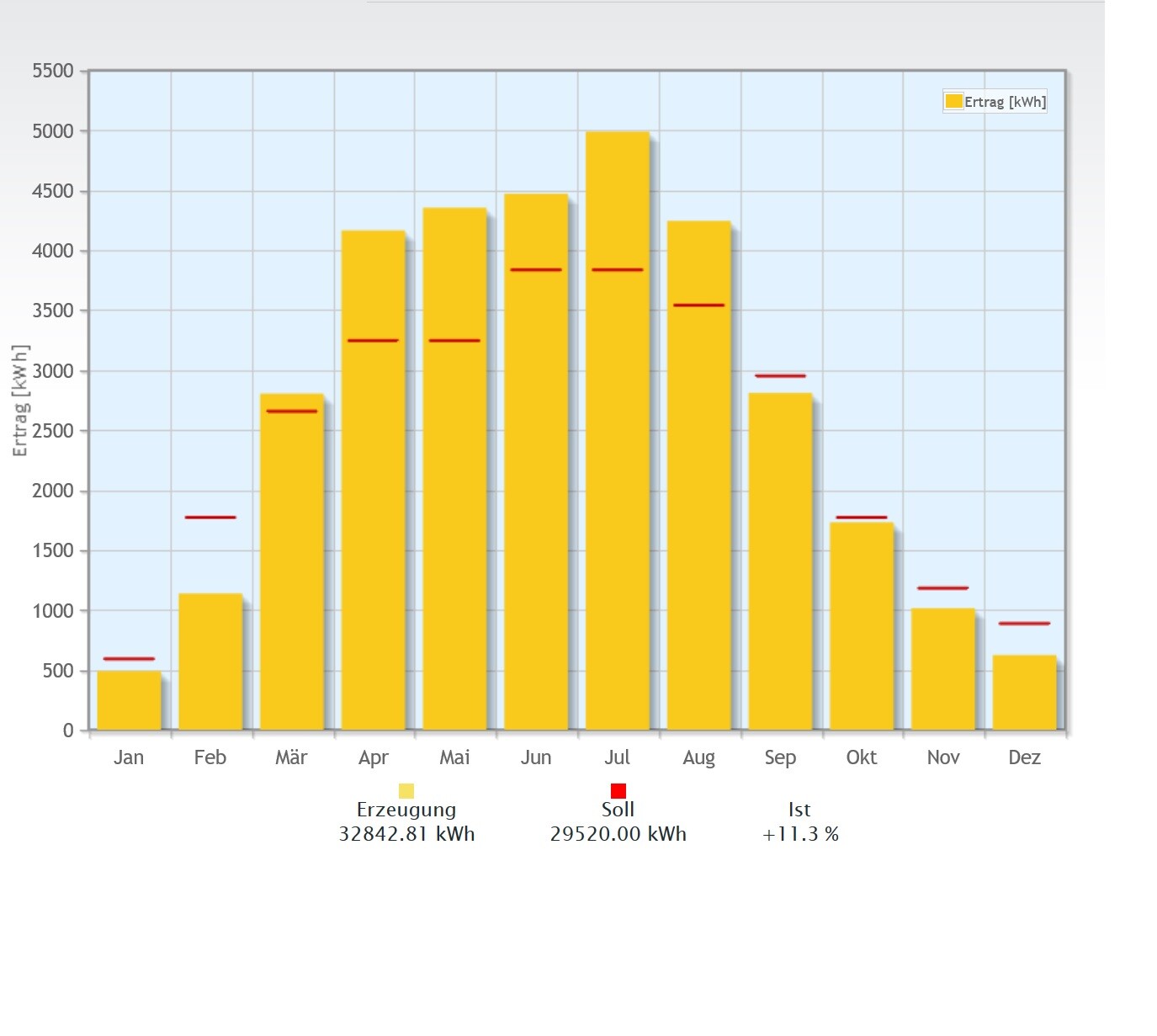 30kWp ist die installierte Leistung die die Anlage maximal bringen kann. Die habe ich aber noch nie erreicht. das höchste das ich je hatte waren 29. Der über das Jahr geleistete ertrag ist aber auch noch von den Sonnenstunden abhängig und von der Außentemperatur. Je kälter es ist umso mehr Leistung kommt bei Sonneneinstrahlung runter. Und wie mein Logger ja zeigt können in günstigen Jahren eben mehr als die Theoretisch in unseren breiten üblichen Sonnenstunden zusammenkommen. deswegen sind ja auch diese ganzen rechnenspiele nur Theorie. wenn du mit 950 Sonnenstunden rechnest dann wirst du feststellen das die anlagen mehr bringen können da die sonne sich nicht um unsere Theorie kümmert