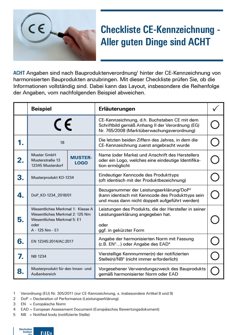 Widerspruch?Jein. Die CE-Kennzeichung erfolgt durch den Hersteller selbst. Er hat aber einige Vorgaben einzuhalten, z.B. auch wie zu prüfen ist.Es gibt vom DIBt auch eine Checklist - habe ich schon mal gepostet -, wie die CE-Kennzeichnung zwingend auszusehen hat. Und da fängt es beim TE schon an, dass noch nicht einmal die vorgeschriebene Schriftart genutzt wird. Von anderen Punkten ganz zu schweigen.