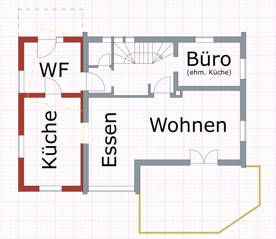 Größter Nachteil der Lösung ist, dass fast alle Hausanschlüsse (Strom, Wasser, Fernwärme) umverlegt werden müssten, da diese nicht überbaut werden dürfen. (kommen straßenseitig von Westen ins Haus)Wo liegen denn die im Plan? Sie führen in den Keller, oder? Wo ist denn der Leitungsschacht bzw für Wasser Küche und Kinderbad?Hattet ihr bis jetzt noch nichts von den Ideen umgesetzt?