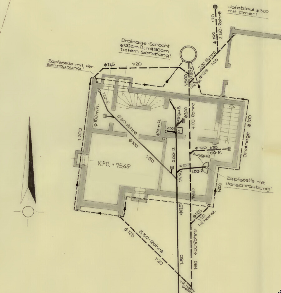 In der nordwestlichen (planobenlinks) Ecke vom Gebäude ist ein Abwasserfallrohr, dass bis ins OG reicht. Da kann ein Teil vom neuen Bad mit angeschlossen werden.