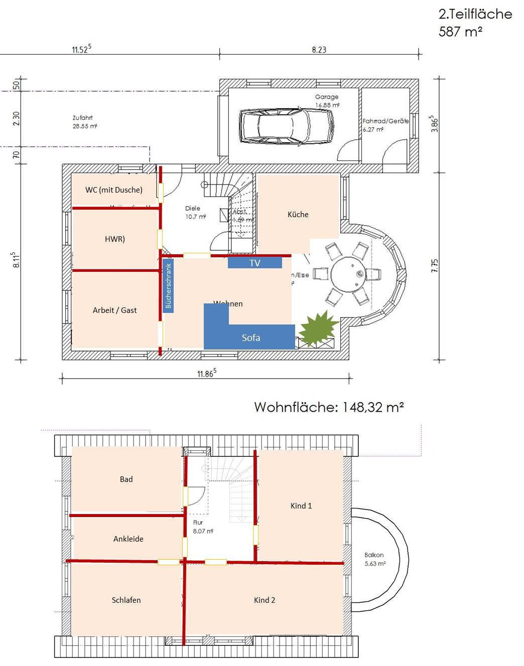 - Ankleide kann nur einseitig genutzt werden (für mich würde ich die weglassen und Schlafzimmer und Bad zuschlagen, aber "mini"-Ankleiden sind gerade hip und lassen sich vielleicht gut verkaufen)