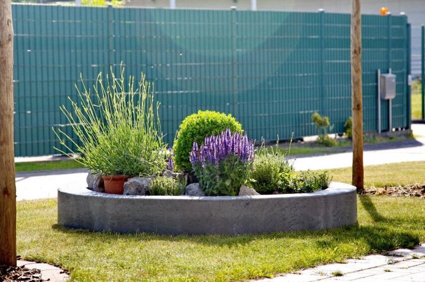 Runder Betonkübel mit Lavendel, Gräsern und Kräutern vor grünem Zaun.