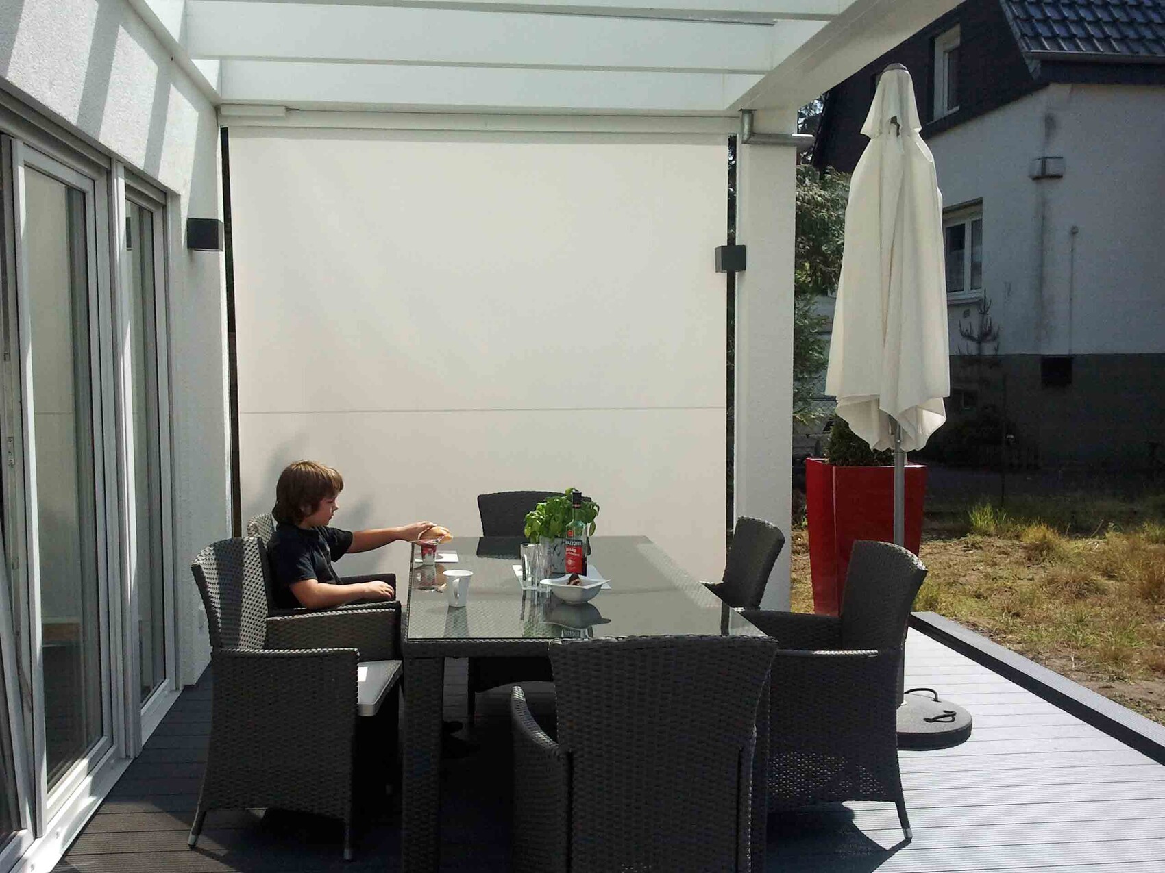 Im Grunde haben wir erst mal die komplette Überdachung vorgesehen. Tatsächlich fragen wir uns auch, ob nicht z. B. die Hälfte dann auch ausreichen würde. Groß genug wäre es allemal.