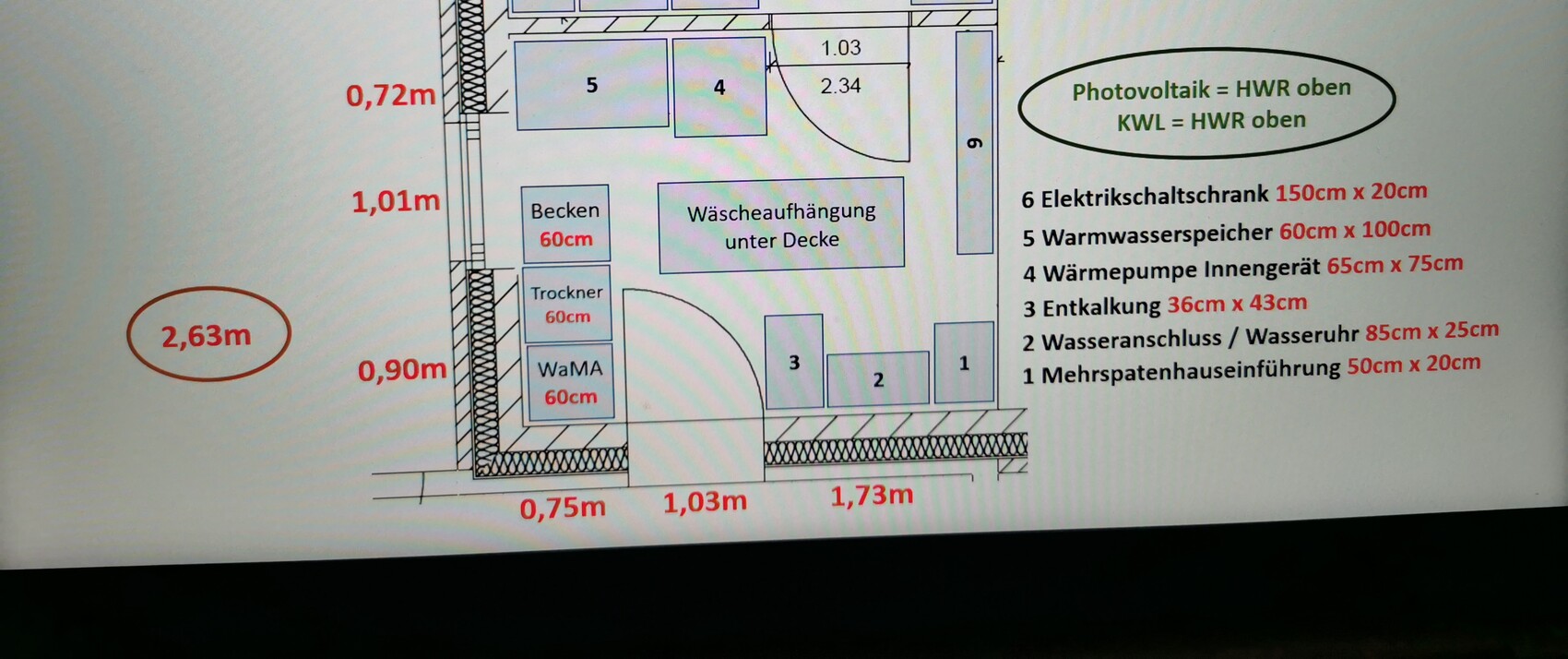 Falls ihr noch nicht fix seid ein Vorschlag... Photovoltaik-Speicher und Wechselrichter kann man problemlos übereinander hängen. Lüftungs-Verteiler sparen Platz, wenn man sie an die Decke montiert.