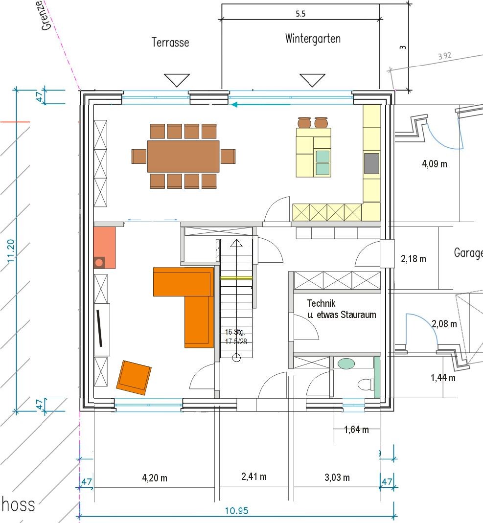 Soll der Wintergarten die 3x5 m haben? Wozu eigentlich dann den zweiten Bereich mit großem Esstisch? Das erschließt sich mir leider überhaupt nicht. Wohnbereich wäre ja wg. Geräuschen zu schließen.