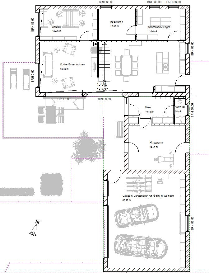 - Das Haus steht sehr mittig im Baugrund, wobei dann ein sehr großer Nordgarten bleibt, den wir aber eher im Süden haben möchten (Maximierung Südgarten)