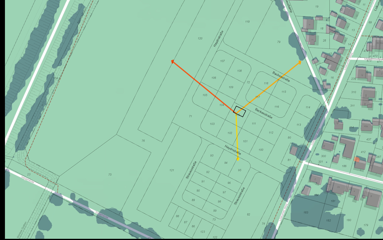 Ganz hilfreich das nochmal direkt vor Augen zu haben. Zeigt klar, dass wenn wir den Fokus eher auf Nachmittags-/Abendsonne legen, wir - wie von euch genannt - die Garage und Wirtschaftsräume eher Richtung Osten legen sollten. Falls Garage doch im Westen platziert werden würde, sollten wir auf jeden Fall Abstand davon nehmen diese so weit in den Garten überstehen zu lassen.
